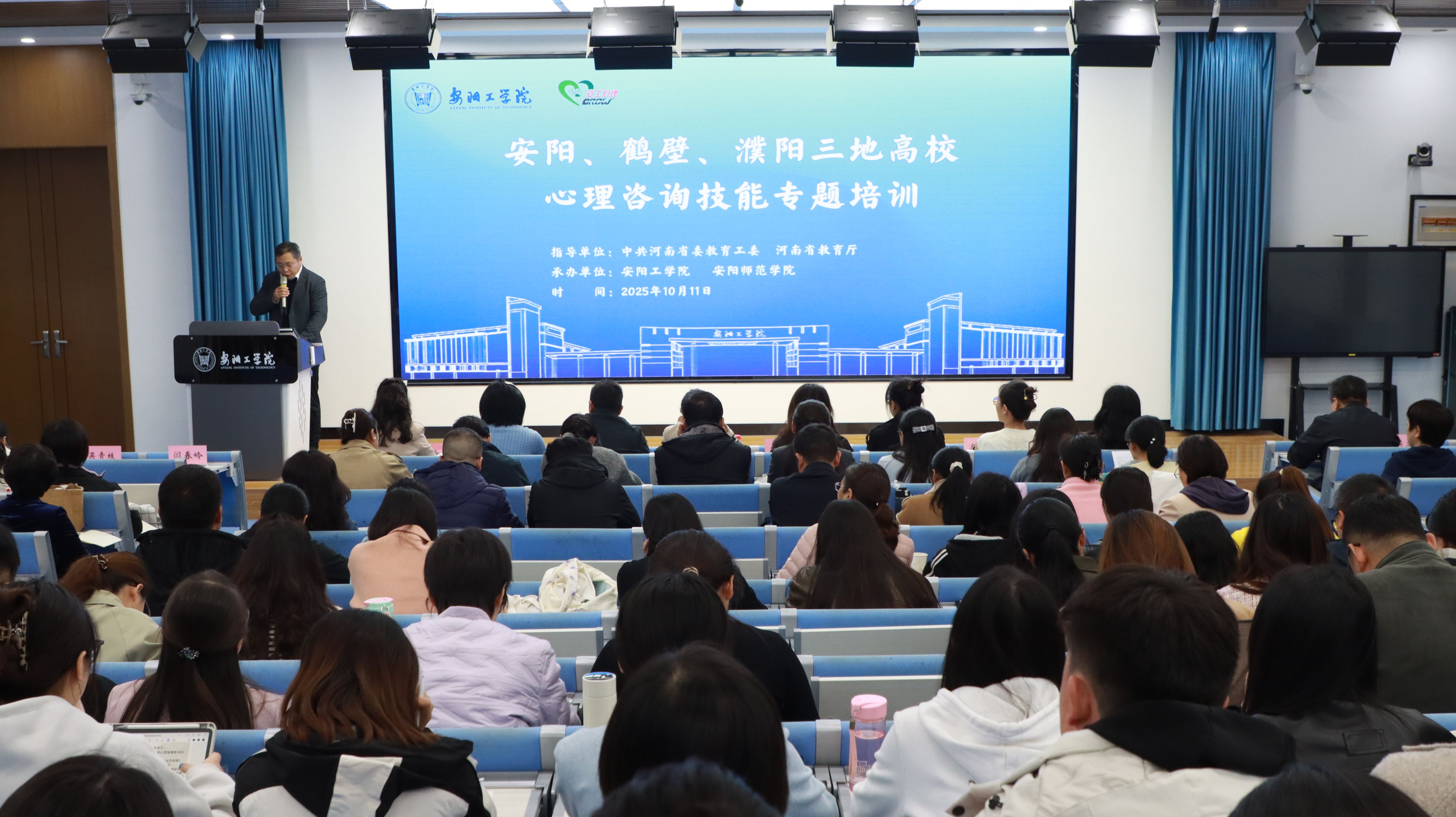 为进一步加强我省高校心理健康教育队伍建设,提升高校心理咨询师的专业素养与实务能力,推动区域高校心理育人工作高质量发展,10月11日下午,在省委教育工委、省教育厅指导下,由我校承办的安阳、濮阳、鹤壁三地高校心理咨询技能专题培训顺利举办。副校长闫春岭出席培训并致辞。北京师范大学心理学部教授张澜作为特邀专家出席培训。来自安濮鹤三地十余所高校的专兼职心理咨询师、学工队伍、辅导员等近200人参加了本次培训。